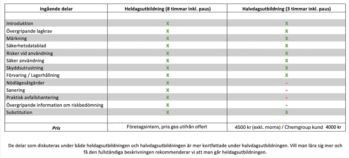Syftet med utbildningen är att verksamheten ska ha en säker hantering av kemiska produkter/riskkällor genom att vara insatta i regler som styr och risker som kan uppkomma. Deltagarna ska veta hur de ska använda och lagerföra kemikalier på säkert sätt samt hur de ska agera vid nödlägen.